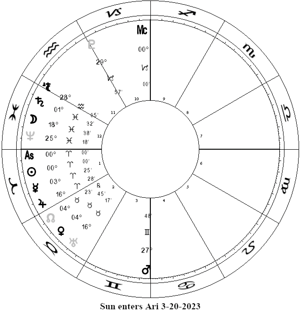 This year, the Sun enters Aries on Mar. 20, 2023, at 4:24 pm CDT, and remains there until Apr. 19, 2023, at 11:12 pm CDT. Here's the solar chart for the 2023 Aries ingress: