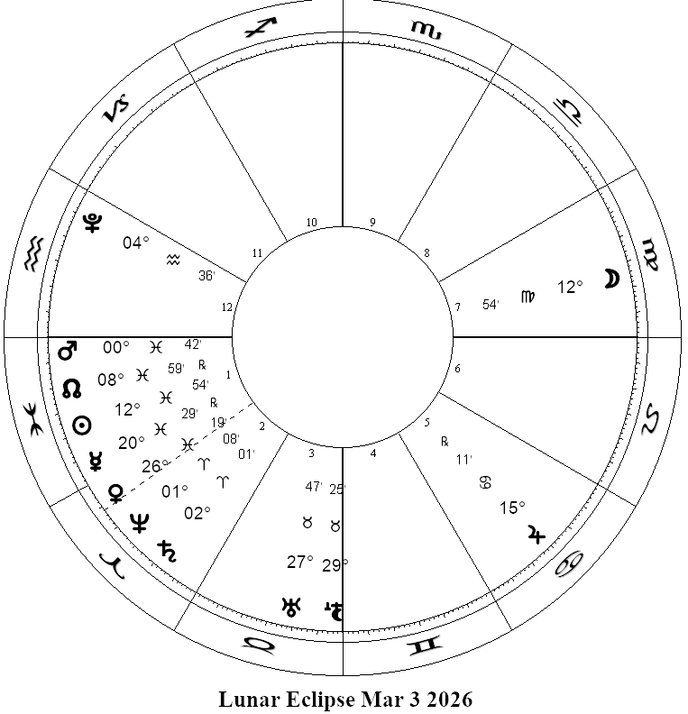 The ruler of an eclipse also has something to say about how the eclipse is processed. At the time of the eclipse, Virgo’s ruler, Mercury, is in Pisces, where it is both in detriment and fall.